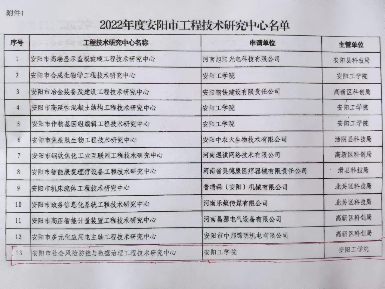 近日,安阳市科技局公布《关于认定2022年度安阳市工程技术研究中心和重点实验室的通知》(安科〔2022〕64号),yl6809永利官网集团申报的“安阳市社会风险防控与数据治理工程技术研究中心”被顺利批准建设。
