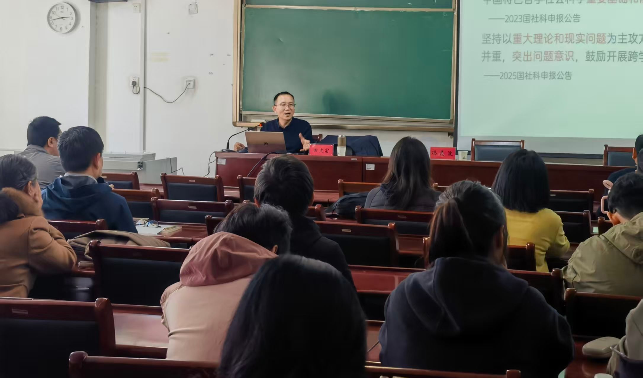报告会上,田文富教授结合自身多次成功申报国家社科基金项目的经验,从“选题”与“论证”两大方面展开系统讲解。他强调,选题应突出时代特征和问题导向,聚焦党和国家事业发展中的重大理论与现实问题,同时,选题表述应科学严谨、简明规范、避免歧义。在项目论证方面,他详细讲解了研究内容、总体框架、重点难点、创新之处等关键环节的撰写要点。此外,田教授还结合2025年省社科项目的新变化,介绍了“青年专项”“文化专项”等新增类别,鼓励青年教师立足河南发展实际,积极开展具有咨政功能的应用对策研究。